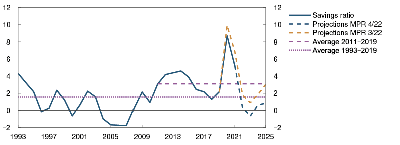 The housing market has turned. House prices have fallen faster than projected, and the number of unsold homes has increased markedly. House prices are expected to fall further in the period to autumn 2023. A reduction in household wealth due to a fall in house prices, combined with the prospect of a notable decline in household real disposable income in 2023, pushes down consumption between 2022 and 2023. The household saving ratio is declining, and saving is expected to remain low ahead.