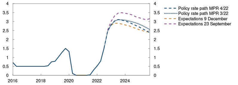 Norges Bank’s Monetary Policy and Financial Stability Committee decided to raise the policy rate from 2.5% to 2.75% at its meeting on 14 December. Based on the Committee’s current assessment of the outlook and balance of risks, the policy rate will most likely be raised further in 2023 Q1.
