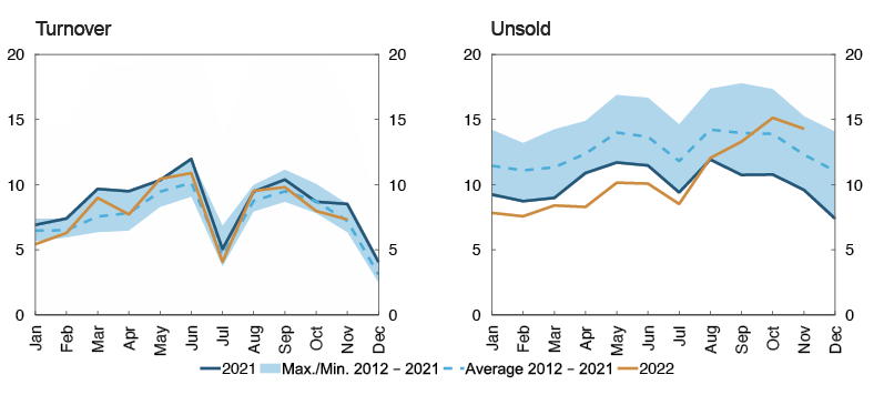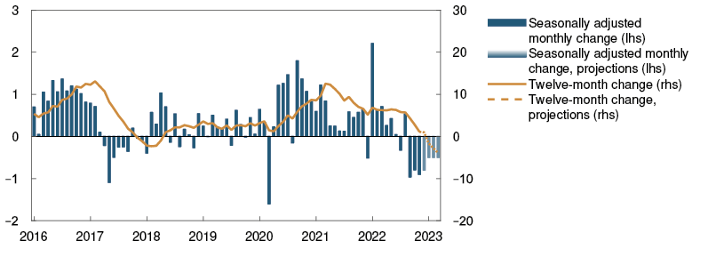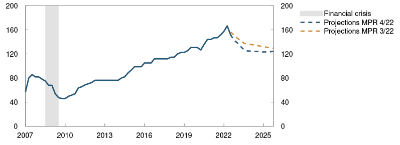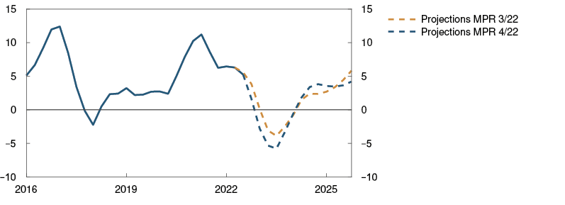 Activity in the Norwegian economy is projected to fall in the near term. Higher inflation and a weaker housing market are expected to contribute to a more rapid cooling of the Norwegian economy than envisaged in September. Substantial investments in the petroleum industry and activities related to climate transition are expected to lift activity somewhat further ahead.