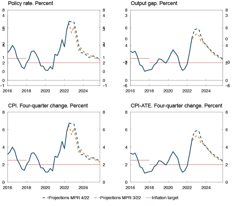 The policy rate forecast indicates a policy rate of around 3% in 2023, slightly higher than in the previous Report. In the projections, inflation falls and approaches the inflation target further out. The output gap falls, and output stays somewhat below potential in the coming years. Unemployment then increases somewhat, albeit from a low level.