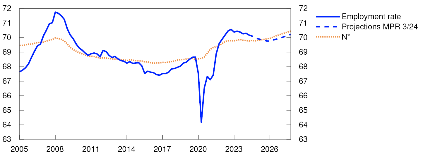 Overall output in the Norwegian economy appears to have been around potential since the beginning of the year. Registered unemployment has shown little change in recent months and was 2.0% in August, as projected in the June Report. LFS unemployment data indicate that unemployment has been stable around 4% since March 2024. Employment was little changed in Q2, broadly as expected.