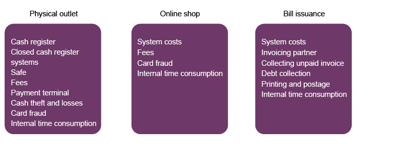 Resource use by businesses and the public sector comprises labour costs for employees and equipment costs, such as cash registers, safes and payment terminals (for points of sale). Many of the costs for businesses and the public sector are IT-related.