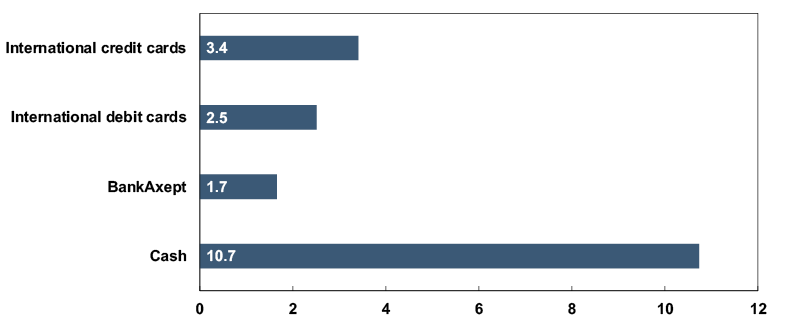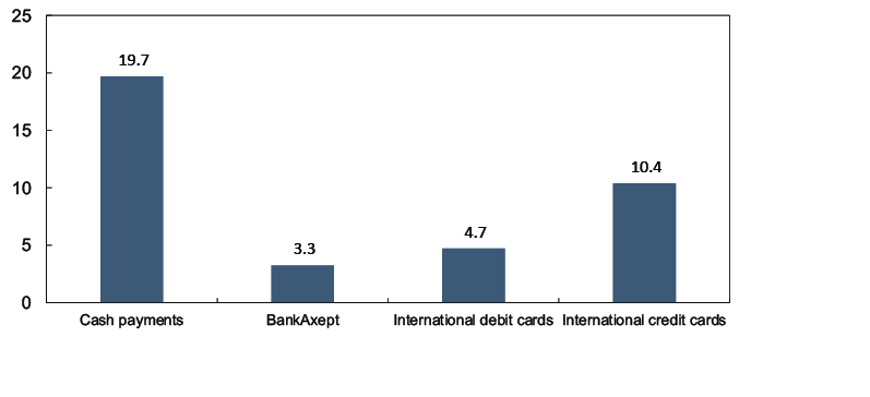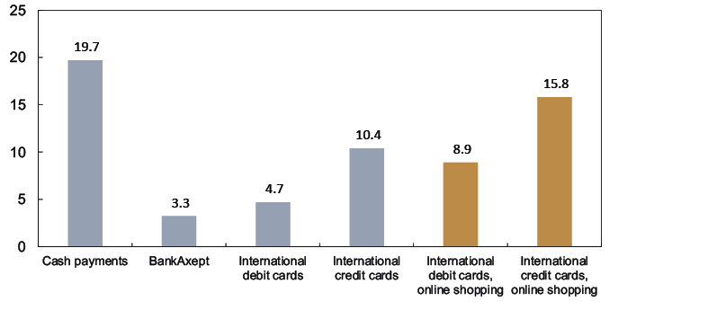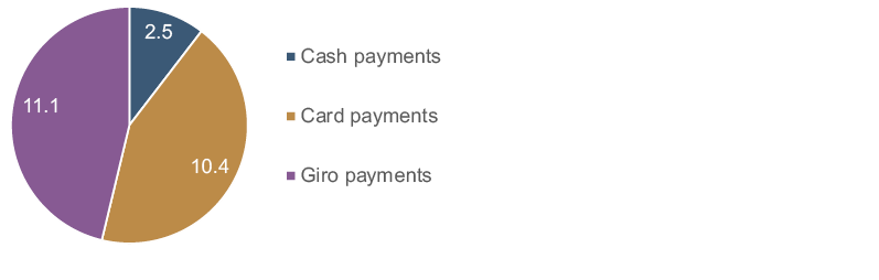 There has been a shift away from cash towards electronic payments. Both giro payments and card payments have increased by 45 percent since 2013. Growth in giro payments is largely in the form of mobile instant payments4, while growth in card payments has been particularly strong for international cards. This is primarily due to strong growth in online purchases.