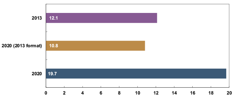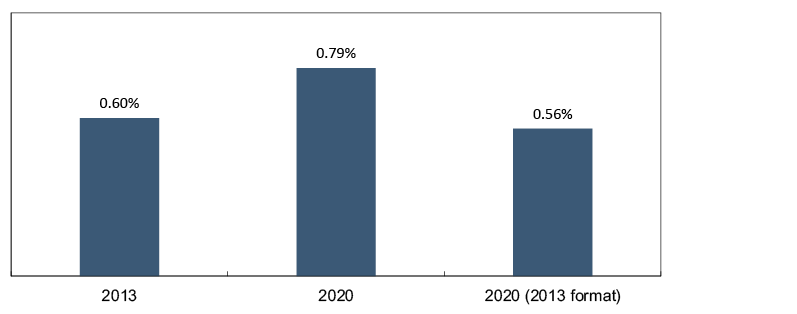 Social costs accounted for 0.79 percent of mainland GDP. In the 2013 cost survey, social costs were estimated to be 0.60 percent of mainland GDP (Chart 3).3 We have also estimated costs in 2020 using the same format/scope as for the 2013 survey (see Box 1 for information on the main differences between the two surveys). Using the same format as in 2013, costs in 2020 amounted to 0.56 percent of mainland GDP. Total costs in real terms have thus declined somewhat.