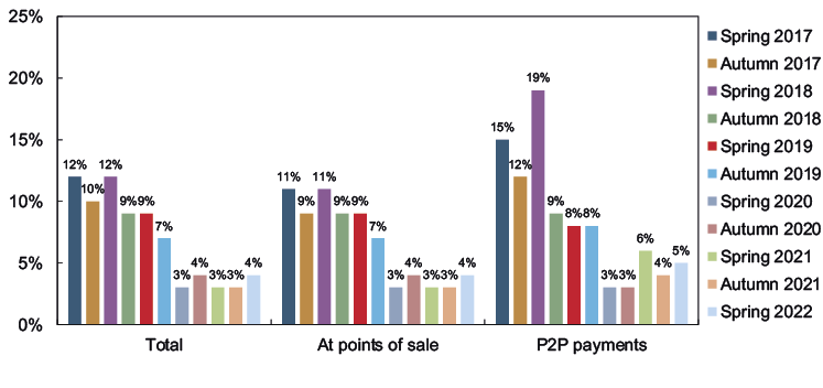Chart 5 The use of cash at points of sale and for P2P payments. Results of semi-annual household surveys. 2017-2022. Percent
