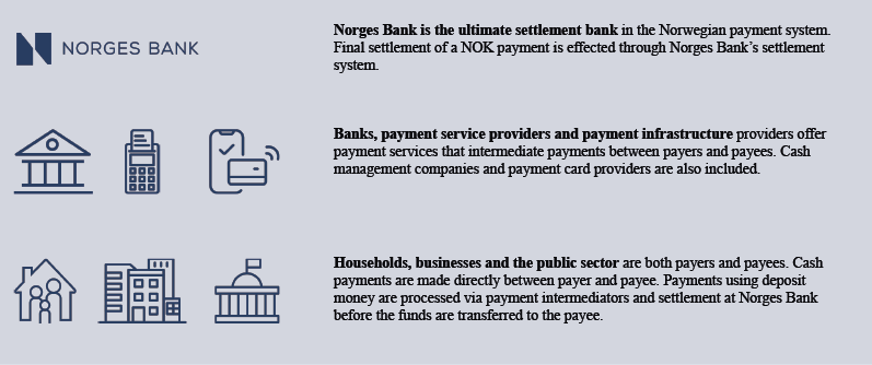 Pursuant to the Central Bank Act, Norges Bank is responsible for promoting an efficient and secure payment system where payments can be carried out swiftly, securely, at low cost and tailored to users’ needs.