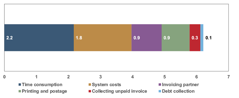 The unit costs for an invoice are NOK 6.2 and comprise time spent (NOK 2.2), system costs (NOK 1.8), expenses for the invoicing partner (NOK 0.9), printing and postage of physical invoices (NOK 0.9), expenses for collecting an unpaid invoice (NOK 0.3) and debt collection costs (NOK 0.1) (Chart A3.10).