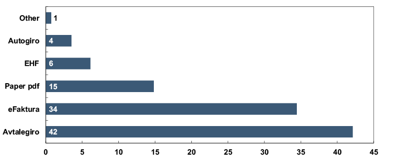 In 2020, the 42 businesses that bill their customers collected payment via 101 million invoices and direct debits, of which 86 million were e-invoices and direct debits. Of the 86 million, 42 million were direct debits (including combination products such as Avtalegiro (direct debit for households) combined with eFaktura (e-invoice)), 34 million were eFaktura invoices, 6 million were EHF invoices and 4 million were Autogiro (direct debit for businesses). The businesses issued 15 million invoices on paper or as email attachments (15 percent of the total number of invoices issued) (Chart A3.11).
