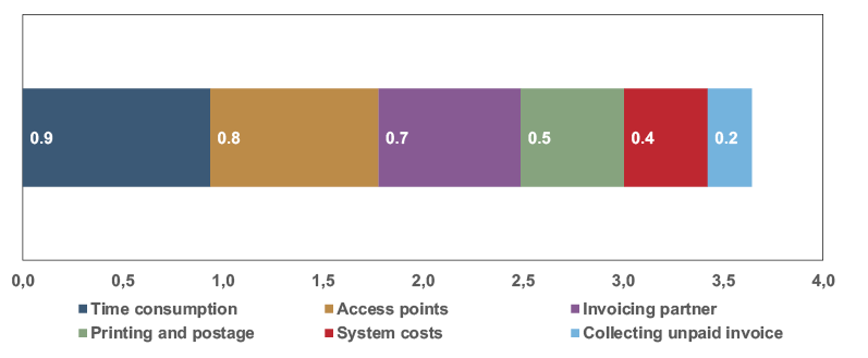 The unit cost for invoices and direct debits was NOK 3.6. Of this, NOK 0.9 was time consumption by the enterprise, NOK 0.8 was the cost of access points, NOK 0.7 costs for an invoicing partner, NOK 0.5 printing and postage costs, NOK 0.4 costs for invoice generation systems and NOK 0.2 payment collection costs (Chart A3.12).
