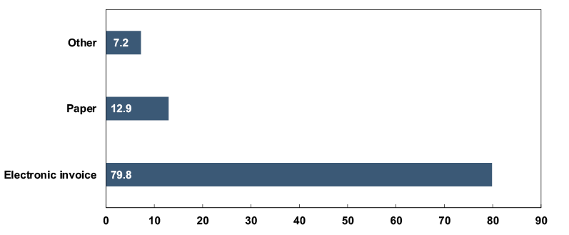 The businesses mainly received e-invoices. Of their total payments, about 80 percent were e-invoice payments (eg Autogiro, EHF and EDIFACT). About 13 percent of the payments originated from an invoice sent on paper or as an email attachment, while 7.2 percent did not originate from an invoice (Chart A3.13).