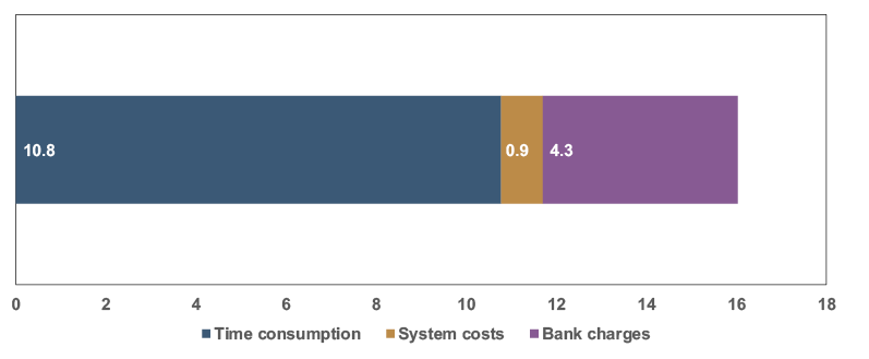 Businesses’ cost of sending payments is NOK 16.0 per payment, comprising time consumption (NOK 10.8), variable financial and accounting system costs (NOK 0.9)26 and bank charges (NOK 4.3) (Chart A3.14).