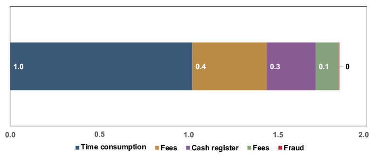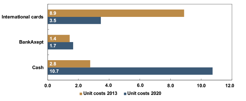 One of the main reasons for the increase in businesses’ unit costs for cash payments is the considerable reduction in the number of cash payments since 2013. Cash payment costs are mainly fixed costs that must be paid regardless of the number of cash payments the business receives (safe depreciation costs, costs related to a closed cash register system, time spent on reconciling and closing cash registers etc.). These fixed costs are now spread across far fewer payments.