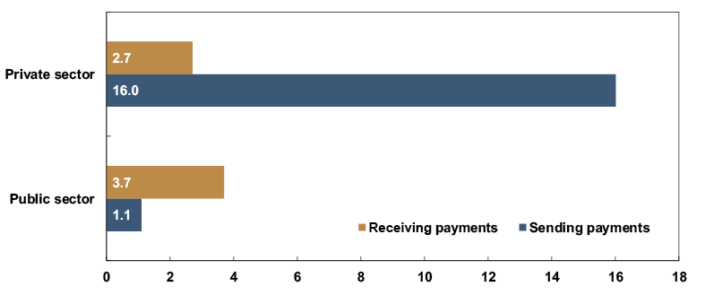 Owing to economies of scale, unit costs for outgoing payments are much lower for the public sector than for private sector businesses (NOK 1.1 for the public sector compared with NOK 16.0 for businesses). The bulk of outgoing payments are made by NAV, which has largely automated its payment processes. NAV’s fixed costs are spread over a large number of payments. For businesses, costs are spread over a much lower volume of payments, and because of the low volume, it is also less profitable to make large investments to reduce the marginal cost of a payment. The costs of receiving a payment are on average NOK 1 higher for the public sector than for private sector businesses (NOK 3.7 for the public sector compared with NOK 2.7 for private sector businesses) (Chart A4.1).