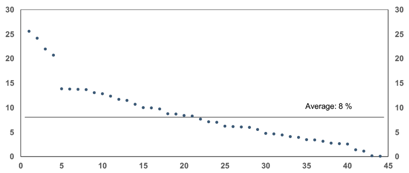 The Norwegian Government Agency for Financial Management shared the underlying data from a benchmark survey conducted on behalf of the Agency by Ernst & Young, where government institutions with shared functions are compared. The method behind the survey shares some properties with the method used by banks in their reporting. The results of the benchmark survey are presented in the Norwegian Government Agency for Financial Management annual report (see for example the table on page 77 in the publication “Direktoratet for forvaltning og økonomistyring” (2021)). In the benchmark, various processes are first identified, such as managing wages and disbursing travel and expense refunds. Each process is then divided into different activities that support the process (such as recording working hours, monitoring changes in the tax base, answering pay-related questions, or processing payroll payments). Each process is divided into the following five cost elements: labour costs, system costs (licenses, software, IT infrastructure, depreciation of IT systems, etc.), indirect costs (rent of office space, water, gas, electricity, insurance, etc.), outsourced costs and other costs. The figures used here are adapted to the purpose of this survey, as the benchmark survey covers more than just payment costs. Among other things, costs have been adjusted according to the proportion of processes assumed to be directly related to receiving or sending payments.