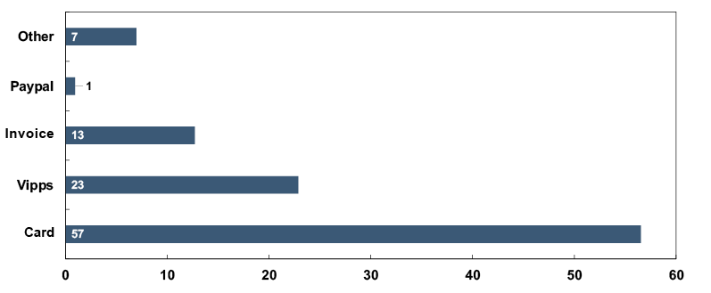 The survey focuses on domestic payments made by households, businesses and the public sector. The analysis does not cover bank-to-bank payments, Norwegians’ use of payment services abroad, foreigners’ use of payment services in Norway or cross-border online purchases. Payments using cheques, fuel cards, e-money and crypto-assets are also excluded. The volume of such payments in Norway is likely relatively limited.