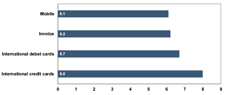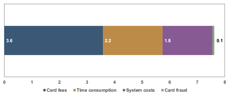 The reason that time consumption and system costs are the same for invoices and cards is that these processes are common to all online shopping payment methods. Costs are allocated among payment methods according to the share of payments for which the respective payment methods are used. As a result, per payment costs will be the same across payment methods.