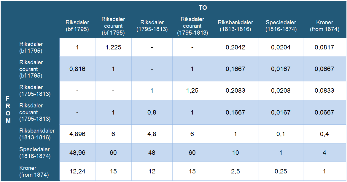 When using the price calculator, make sure that the starting amount is stated in the monetary unit you want to calculate inflation in. The conversion between the different monetary units in Norway from 1492 is done by multiplying with an adjustment factor according to the following table: