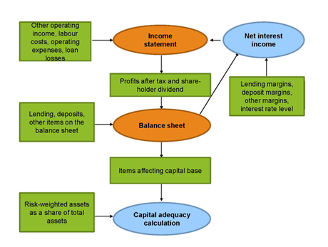 The income statement and balance sheet are mutually dependent. Bank earnings after tax and dividend directly affect bank equity, a balance sheet item. At the same time, net interest income, which is recognised in profit and loss, will be determined by the performance of the balance sheet items deposits, loans and other interest-bearing assets and liabilities.
