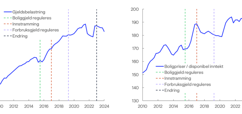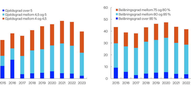 1 Stiplede stolper markerer: i) Fra juli 2015. Forskrift med krav til belåningsgrad, rentestresstest og avdrag. Med fleksibilitetskvote. ii) Fra januar 2017 krav også til gjeldsgrad, samt eget og strammere krav til både belåningsgrad for sekundærbolig og fleksibilitetskvote i Oslo. iii) Fra februar 2019 krav til avdrag og rentestresstest. Med fleksibilitetskvote. iv) I 2023. Lån med annen pant enn bolig reguleres, fjerning av særskilt krav til sekundærbolig i Oslo, justert rentestresstest.