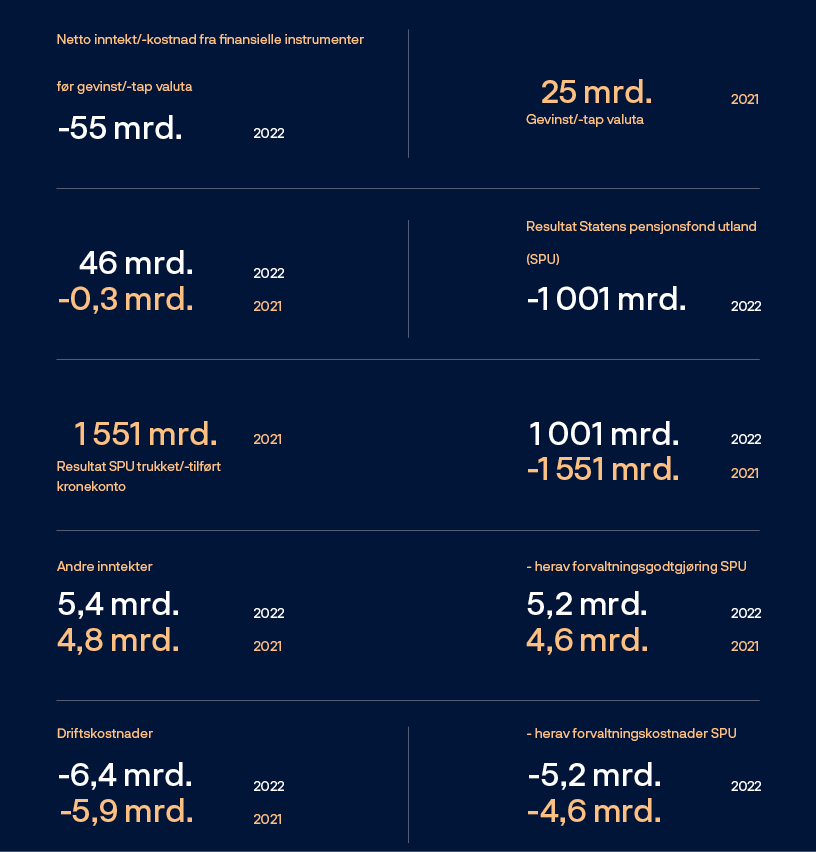 - Totalresultatet på -11,1 milliarder kroner disponeres i tråd med «Retningslinjer for avsetning og disponering av Norges Banks overskudd» ved at 13,2 milliarder kroner tilbakeføres fra kursreguleringsfondet til resultatregnskapet. Fra årets resultat avsettes 2,1 milliarder kroner til overføringsfondet. Fra overføringsfondet overføres en tredjedel – 8,1 milliarder kroner – til statskassen.