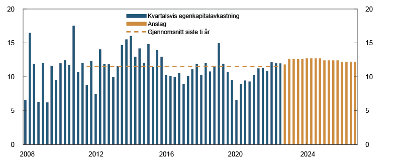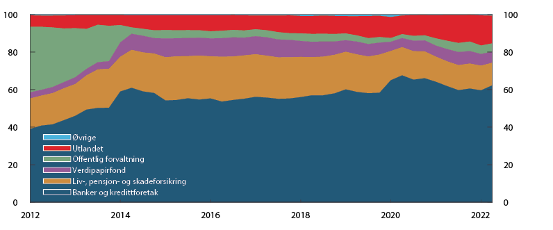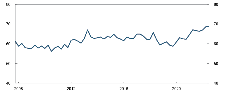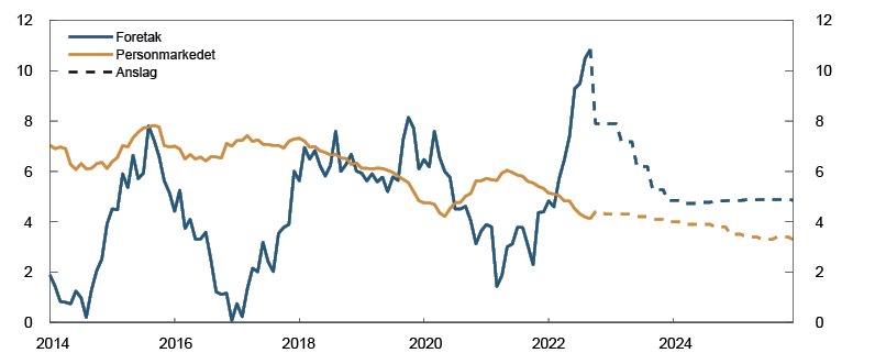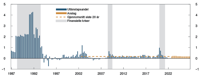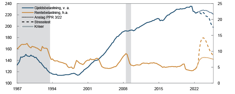 Rentebelastningen, det vil si andelen av inntekten som går til å betjene renter på lån, falt til et historisk lavt nivå under pandemien. Over 90 prosent av husholdningene har flytende rente på lånet, og rentebelastningen vil stige fremover i takt med økte utlånsrenter. Gjeldsbetjeningsgraden, som også inkluderer beregnede gjeldsavdrag, ventes å stige som følge av økte renter og et høyt gjeldsnivå. I Norges Banks utlånsundersøkelse 3/22 fra oktober rapporterte bankene om litt lavere etterspørsel etter lån fra husholdninger i tredje kvartal, og flere banker rapporterte om noe økt bruk av avdragsfrihet på nye lån. Kredittpraksisen var samlet sett om lag uendret i tredje kvartal, og bankene venter en liten innstramming i kredittpraksisen i fjerde kvartal. De neste årene venter vi at gjeldsveksten blir noe lavere enn inntektsveksten, slik at gjeldsbelastningen vil avta, se Pengepolitisk rapport 3/22 og figur 3.1 i stresstesten i kapittel 3. Det kan på lengre sikt bidra til å redusere sårbarheten ved høy gjeld. Det er imidlertid stor usikkerhet om den økonomiske utviklingen fremover.