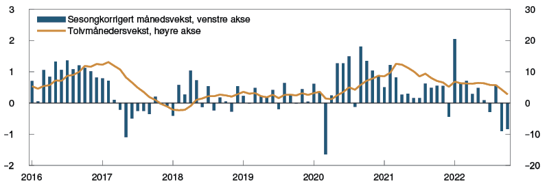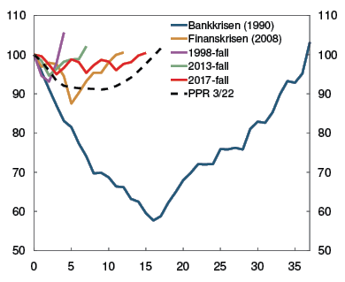 Boligprisene har over lengre tid vokst raskere enn inntektene til husholdningene. Prisene har falt i høst, og vi har sett den samme tendensen i andre land. Anslagene i siste pengepolitiske rapport tilsier et moderat fall i norske boligpriser neste år. Usikkerhet om den makroøkonomiske utviklingen og husholdningenes tilpasning til økte renter gjør at prognosene for boligprisene er mer usikre enn normalt. Store og brå fall i boligprisene kan føre til innstramminger i husholdningenes konsum og gi økte tap på bankenes utlån.