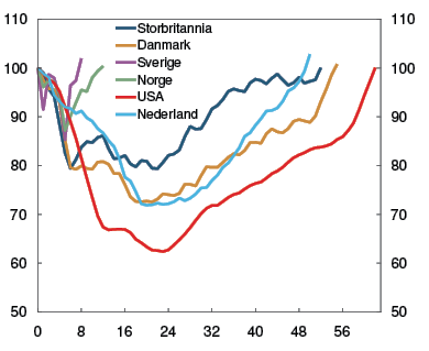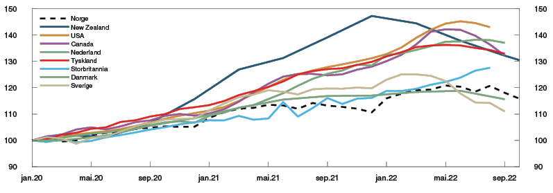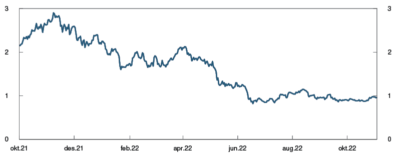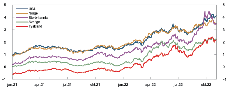I årene etter finanskrisen var inflasjonen lav internasjonalt, og de fleste land hadde historisk lave rentenivåer. Det bidro til høy risikotaking og høye aktiva- og eiendomspriser. Pandemirelaterte forhold både på tilbuds- og etterspørselssiden og krigen i Ukraina har bidratt til markert oppgang i inflasjonen hos viktige handelspartnere siden i fjor høst. Redusert gasseksport fra Russland har bidratt til høye energipriser. Også omstillinger i energiproduksjonen, som utfasing av atomkraft i enkelte land, har trukket energiprisene opp. I møte med økt inflasjon har sentralbanker økt styringsrentene mye det siste året, og markedets renteforventninger indikerer ytterligere økninger det neste året, både i Europa og USA. Langsiktige renter har også steget mye det siste året, se figur 1.1.
