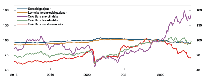 Investorers avkastningskrav til finansielle aktiva avhenger av utviklingen i lange renter og risikopremier. I tråd med økningen i lange renter har avkastningskravene økt og aksjepriser falt internasjonalt, se figur 1.3. Aksjer som har vært priset høyt i forhold til løpende inntjening, som for eksempel enkelte teknologiaksjer, har falt mye. Det er imidlertid tegn til at risikopremiene i internasjonale aksjemarkeder har vært lite endret. Aksjepriser kan derfor være sårbare for en brå reduksjon i investorenes risikotaking. I obligasjonsmarkedene har imidlertid risikopåslagene økt en del, særlig i markedet for foretaksobligasjoner.
