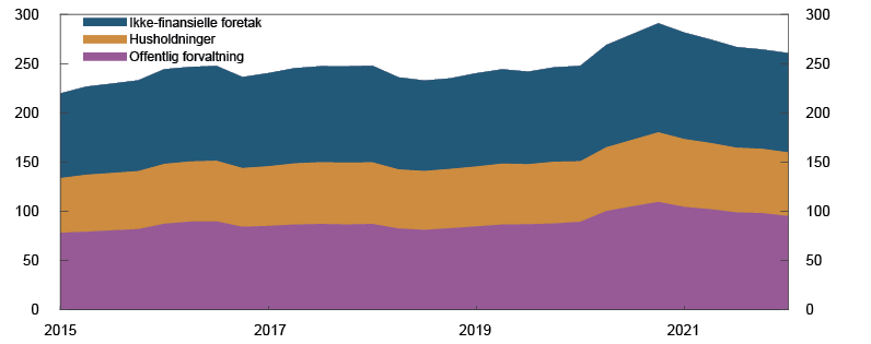Høy gjeld øker faren for at en brå og sterk tilstramming i finansielle forhold får negative konsekvenser for finansiell stabilitet. I perioden med lave renter økte global gjeld i forhold til aktivitetsnivået. Økningen tiltok i starten av pandemien både som følge av økt gjeldsvekst og et kraftig fall i BNP, se figur 1.2. I tråd med økt aktivitetsnivå ble utviklingen delvis reversert gjennom fjoråret, og ved utgangen av 2021 var den globale gjeldsbelastningen på drøyt 260 prosent. Det er særlig offentlig forvaltning som har økt gjelden, noe som må ses i sammenheng med de omfattende støttetiltakene mange land iverksatte under pandemien. Økt offentlig gjeld kan redusere handlingsrommet i finanspolitikken fremover. I tillegg vil høyere rente øke rentebelastningen for mange foretak, husholdninger og stater.