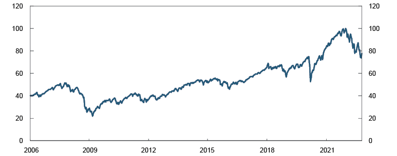 Figur 1.3 Internasjonale aksjekurser har falt betydelig i år3 MSCI global aksjeindeks. Uke 1 2022 = 100