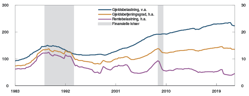 Figur 1.4 Gjeldsbelastningen er på et høyt nivå og rentebelastningen øker6 Prosent