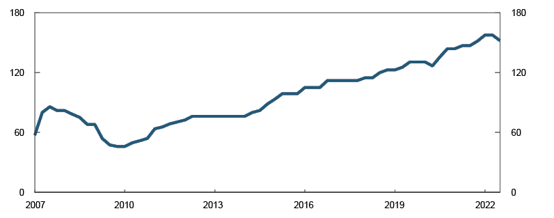 Veksten i gjeld og aktivapriser har ofte vært høy i forkant av finansielle kriser og er indikatorer for syklisk sårbarhet. Priser på flere verdipapirer har falt så langt i år og eiendomspriser har falt i høst etter å ha steget mye gjennom pandemien. Samlet sett vurderer vi syklisk sårbarhet som om lag uendret det siste året.