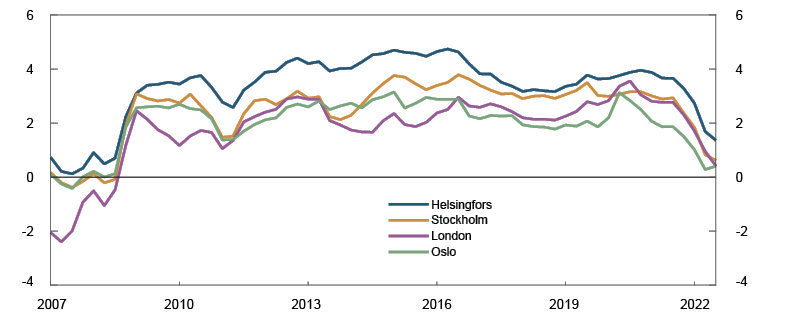 Næringseiendomspriser i Norge og i andre land har steget mye de siste årene. Gjennom pandemien steg prisene i Oslo markert, se figur 1.6. Salgsprisene beregnes som leiepriser delt på et avkastningskrav. Økningen i salgsprisene skyldes både økte leiepriser og lavere avkastningskrav. Det siste året har salgsprisene blitt drevet opp av betydelig leieprisvekst.