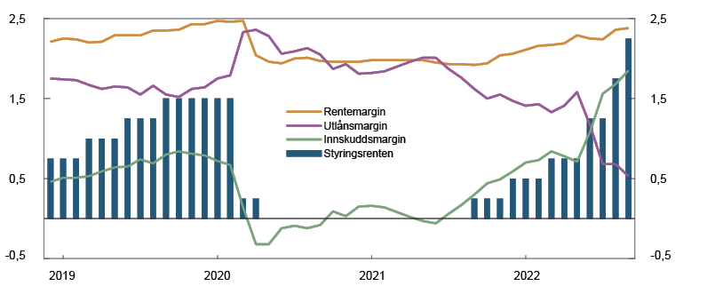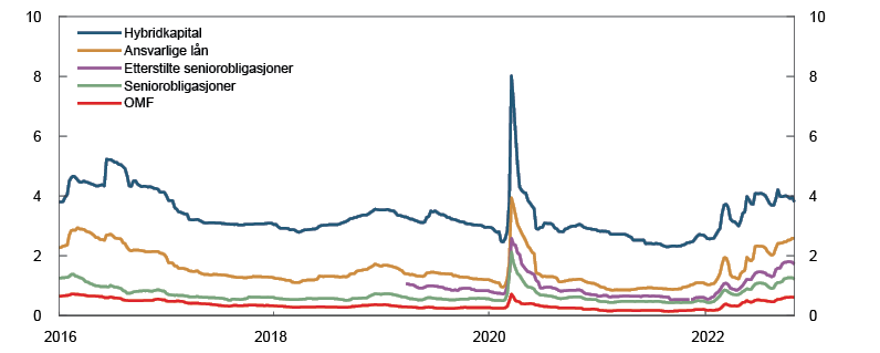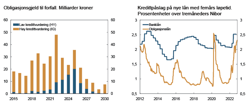 Det siste året har både økning i rentenivå og kredittpåslag økt næringseiendomsforetakenes finansieringskostnader. Næringseiendomsforetak har høy gjeld i forhold til inntekter, og lønnsomheten deres er mer sårbar for økte rentekostnader enn foretak i andre næringer. Mesteparten av gjelden til næringseiendomsforetak er bankgjeld, men obligasjonsgjeld er en stadig viktigere finansieringskilde. Påslagene har økt mye i både obligasjonsmarkedet og for utlån fra banker, se figur 1.8. Et flertall av bankene i Norges Banks utlånsundersøkelse i oktober rapporterer at de som følge av utviklingen det siste året stiller strengere krav til betjeningsevne og egenkapitalandel ved nye næringseiendomslån. I årene fremover forfaller mye obligasjonsgjeld utstedt av næringseiendomsforetak. Et markert fall i prisene på næringseiendom kan føre til at noen næringseiendomsforetak får utfordringer med å hente ny obligasjonsgjeld i markedet samtidig som at det kan være mer krevende å få banklån.