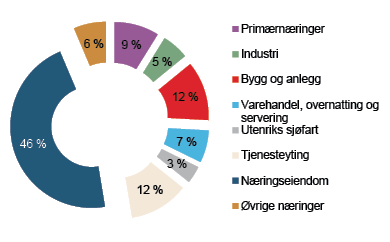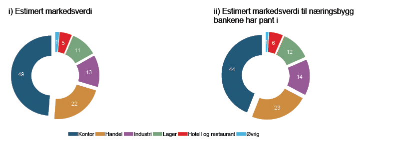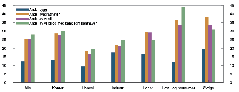 Næringseiendomsmarkedet er heterogent, og kontorbygg er det klart største segmentet. Våre analyser14 viser at bankene er bredt eksponert mot ulike typer næringsbygg. Kontoreiendommer i de største byene utgjør en stor del av verdien til næringsbygg i Norge, og bankene har en betydelig eksponering mot dette segmentet, se figur 1.9. Eksponeringene mot bygg innen handel, industri og lager/logistikk er også store, mens bankene er klart mindre eksponert mot hotell- og restaurantbygg. Bankenes diversifisering på tvers av ulike segmenter demper isolert sett tapsrisikoen på utlån til næringseiendom.