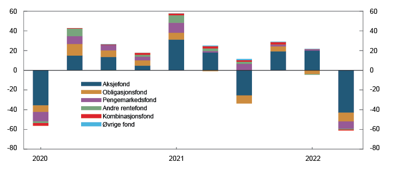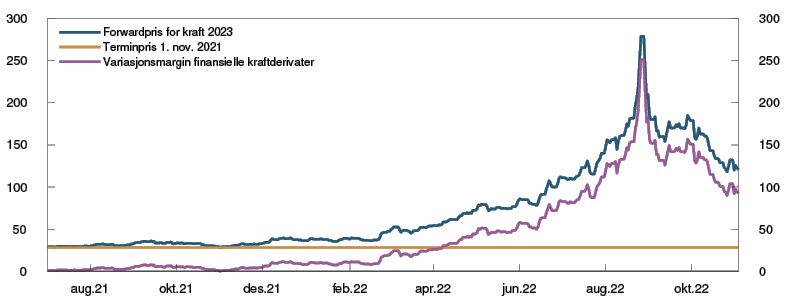 Det har vært store prissvingninger i flere markeder. I finansielle derivatavtaler er det ofte krav om sikkerhetsstillelse (marginkrav) for å redusere motpartsrisiko. De store prissvingningene har ført til betydelig økte marginkrav i flere markeder. Under koronapandemien førte økte marginkrav til likviditetsutfordringer for aktører med store derivatposisjoner, og i Norge ga det kraftige kronefallet likviditetsstress for norske kapitalforvaltere som måtte hasteselge verdipapirer. I år har svært stor oppgang i energipriser tidvis skapt likviditetsutfordringer for nordiske kraftprodusenter knyttet til høye margineringskrav i finansielle derivater de benytter for å sikre seg mot endringer i kraftprisene. Det økte risikoen for ustabilitet i det nordiske finansielle systemet, men myndighetstiltak for å styrke markedsaktørenes likviditet har bidratt til at markedene har fungert bedre. Økte kraftpriser har gitt begrensede problemer for norske aktører, se «Utfordringer i markedet for kraftderivater». I høst førte også kraftige svingninger i britiske statsobligasjonsrenter til økte marginkrav og likviditetsproblemer for flere britiske pensjonskasser, se «Kapitalforvalteres adferd kan forsterke prisfall».