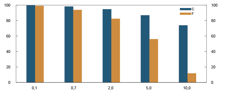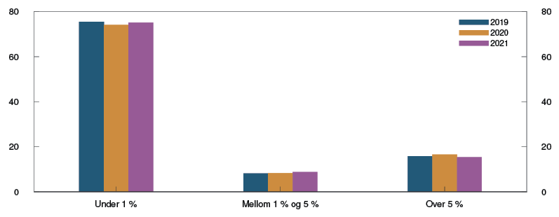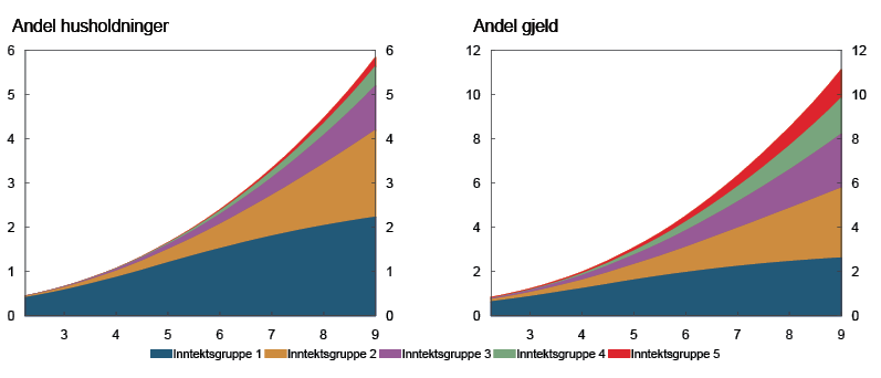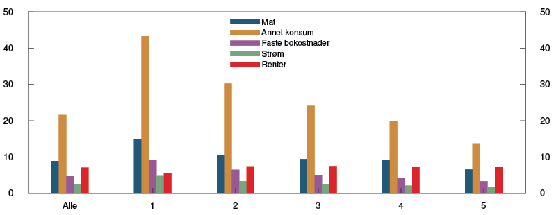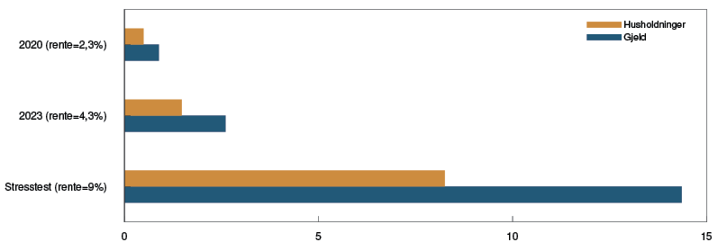 Høy gjeld gjør husholdninger sårbare for bortfall av inntekter, økte renter eller boligprisfall. I tillegg til økte renteutgifter står husholdningene overfor økte utgifter til blant annet mat og strøm. En sensitivitetsanalyse viser imidlertid at de aller fleste husholdninger er i stand til å betjene gjelden. Bare 2–3 prosent av gjelden til boligeiere holdes av husholdninger som kan få problemer med å dekke normale utgifter og ventede renteøkninger med tilgjengelig inntekt og formue, mot om lag én prosent ved pris- og rentenivå som i 2020, se «Husholdningene er robuste overfor moderate økninger i renter og andre utgifter». De fleste av husholdningene med betalingsproblemer er i lavinntektsgrupper. Mange flere vil imidlertid måtte stramme inn på konsumet, noe som kan forsterke en avdemping i økonomien.8 Videre viser analyser9 at mye av den særlig utsatte forbruksgjelden holdes av personer med lav inntekt og som ikke eier bolig, og at dette utgjør en liten andel av samlet gjeld. Vi venter at bankenes tap holder seg lave fremover, se kapittel 2, men tapene vil trolig øke noe på utlån til kunder med svak gjeldsbetjeningsevne.
