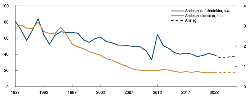 Utviklingen i leieinntekter er viktig for næringseiendomsforetakenes gjeldsbetjeningsevne. På noe sikt er leieinntekter sikret gjennom inngåtte leieavtaler, såfremt leietaker kan betale for seg. Det er vanlig at leien på inngåtte leiekontrakter justeres i tråd med konsumprisveksten, noe som isolert sett bidrar til å styrke næringseiendomsforetakenes gjeldsbetjeningsevne i perioder med høy inflasjon. Et kraftig fall i næringseiendomspriser kan svekke næringseiendomsforetakenes soliditet vesentlig. Dersom prisfallet fører til at verdien av de pantsatte eiendommene blir lavere enn lånene, kan bankene påføres tap ved mislighold av gjelden. Prisveksten på næringseiendom siden finanskrisen har imidlertid ikke vært motsvart av tilsvarende opplåning. Det har økt foretakenes egenkapitalandel, og de står dermed bedre rustet ved prisfall.