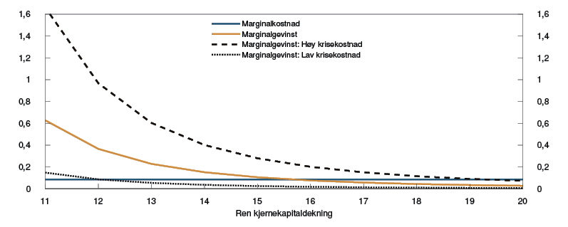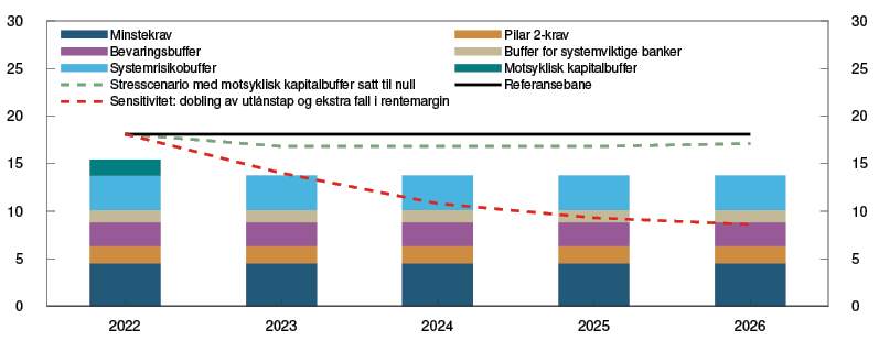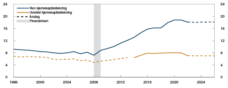 Mer egenkapital i bankene bidrar til finansiell stabilitet fordi det reduserer faren for at bankene bidrar til å forsterke et tilbakeslag. Kraftige økonomiske tilbakeslag kan gi så store banktap at bankene faller ned i kapitalbufferne. Stresstester og sensitivitetsøvelser viser at dagens kapitalnivå i norske banker er høyt nok til at de tåler scenarioer med betydelige tap. Kapitalnivået er også innenfor det analyser indikerer at bankene bør ha i egenkapital på lang sikt. For lav kapitaldekning i bankene er dyrere for samfunnet enn om kapitaldekningen skulle vise seg å være for høy.