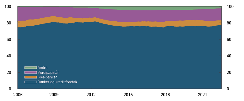 Bankenes høye eksponering mot næringseiendom er en viktig strukturell sårbarhet, samtidig som lave avkastningskrav er en syklisk sårbarhet som øker faren for et stort fall i næringseiendomsprisene. Bankenes utlån til næringen er betydelig og utgjør omtrent halvparten av samlede utlån til foretak (figur 4 i vedlegget). En stor del av eksponeringen er konsentrert hos få banker. Fire banker står for om lag to tredjedeler av samlede banklån med pant i næringseiendom. Erfaringer fra bankkriser i Norge og utlandet har vist at tap på næringseiendomslån har vært en viktig årsak til soliditetsproblemer i banksektoren.