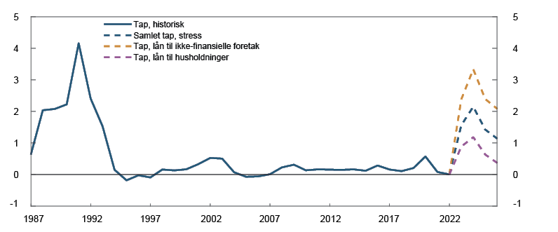 Stresstesten i denne rapporten viser at de største norske bankene samlet er i stand til å møte tapene i et kraftig tilbakeslag hvor inflasjonen er betydelig høyere enn i dag. I stresscenariet fører høye levekostnader og renter til at husholdningene rammes hardt og påfører bankene tap. En del bedrifter drar på den andre siden fordel av høye råvare- og energipriser. Det demper tapene på foretakslån noe, men bankene påføres likevel betydelige tap som følge av et kraftig fall i eiendomspriser, og fordi mange husholdninger strammer inn på konsumet samtidig. Stresstesten viser noen av de mange mulige negative hendelsene det finansielle systemet kan møte, og skisserer et mulig utfall av hvordan det finansielle systemet håndterer et kraftig, men ikke utenkelig, tilbakeslag. Dagens situasjon gjør det særlig viktig at det finansielle systemet bevarer motstandskraft, slik at det kan utføre oppgavene sine effektivt også ved alvorlige tilbakeslag og kriser i økonomien.
