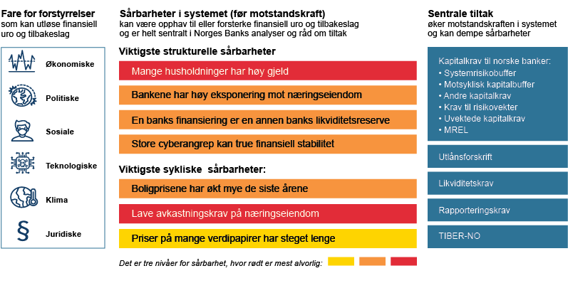 Vurderingen av sårbarheter er basert på historiske erfaringer med hva som har forårsaket eller forsterket tilbakeslag og uro, samt vurderinger av nye trekk ved det finansielle systemet. Vi skiller mellom sykliske sårbarheter, som typisk varierer over tid, og strukturelle sårbarheter, som er mer varige. Det er vanskelig å gjøre et klart skille mellom sårbarhetene, og de ulike sårbarhetene kan forsterke hverandre.