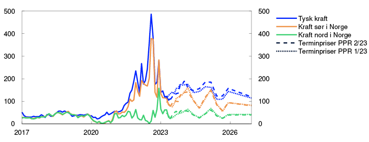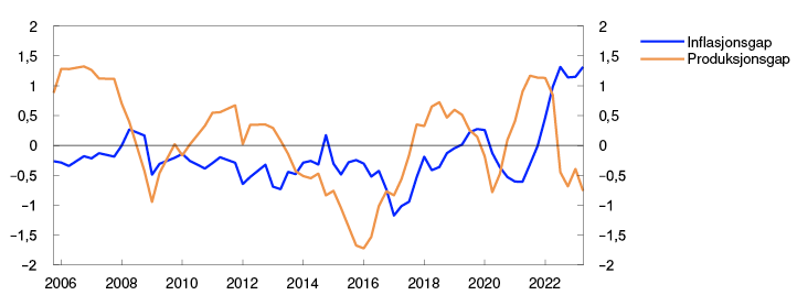 Konsumprisveksten hos våre viktigste handelspartnere har avtatt videre, men er fortsatt høy. Den underliggende prisveksten har holdt seg oppe og vært høyere enn ventet. Kostnadene for å frakte varer mellom land er tilbake på nivåene fra før pandemien, og prisene på flere råvarer, som metaller og matvarer, har falt. Det vil kunne dempe prisveksten på varene vi importerer til Norge. Prisene på gass og kraft har falt noe siden mars, mens oljeprisen har steget litt.