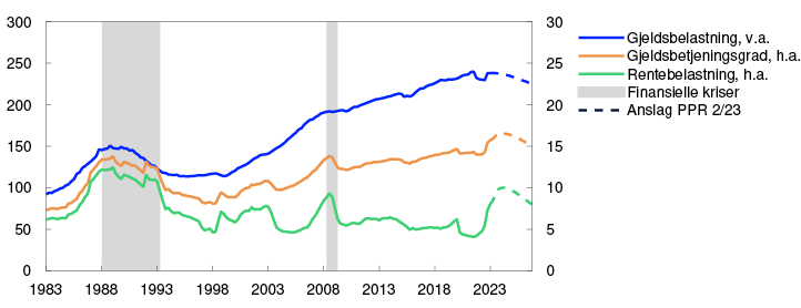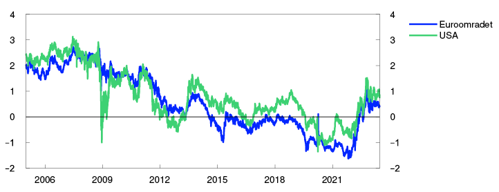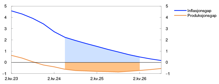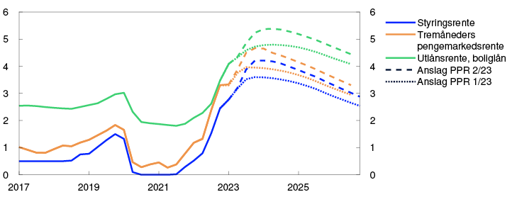 1 Periode: 1. januar 2017 – 31. desember 2026. Dagstall til og med 20. juni. Kvartalstall fra 2. kv. 2023 for PPR 1/23 og 3. kv. 2023 for PPR 2/23. Terminrenter per 21. mars 2023 for PPR 1/23 og 20. juni 2023 for PPR 2/23. For euroområdet vises ESBs innskuddsrente.