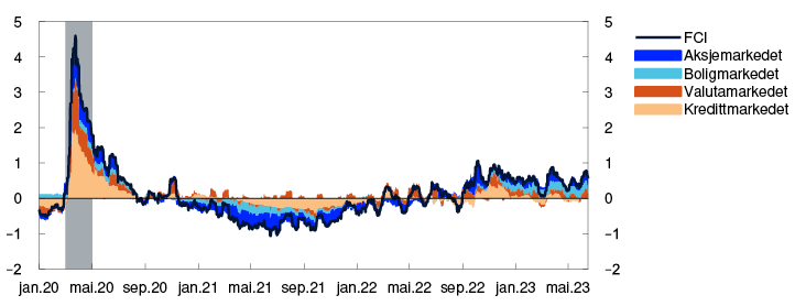 For å få prisveksten ned har sentralbankene hos flere av våre handelspartnere hevet styringsrentene videre. Høy inflasjon og mindre uro knyttet til banksektoren har bidratt til at markedsaktørenes forventninger til styringsrentene ute har økt siden mars. Styringsrentene ventes å nå en topp mot slutten av året. Langsiktige renter og internasjonale aksjeindekser har også steget, mens risikopåslagene i obligasjonsmarkedene har falt siden mars. Samtidig ser det ut til at bankene i USA og Europa har fortsatt å stramme inn på kredittpraksisen overfor husholdninger og foretak.