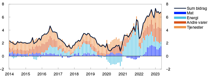 Her hjemme er prisveksten høy. Prisoppgangen omfatter en rekke varer og tjenester. Tolvmånedersveksten i konsumprisindeksen (KPI) har steget og var 6,7 prosent i mai, som var høyere enn anslått i forrige rapport. Det er særlig prisene på energivarer og matvarer som har vært høyere enn ventet. Ulike indikatorer for underliggende inflasjon har steget siden forrige rapport. Tolvmånedersveksten i KPI justert for avgiftsendringer og uten energivarer var 6,7 prosent, også det var høyere enn anslått. Både prisene på importerte varer og varer og tjenester produsert i Norge har steget mer enn ventet.