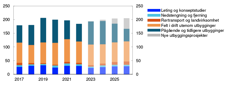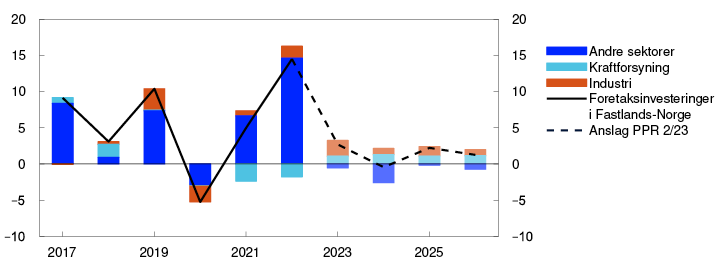 Vi anslår forsiktig vekst i norsk økonomi fremover. Høye petroleumsinvesteringer og økt eksport vil holde aktiviteten oppe. Høyere offentlige utgifter og økte overføringer til husholdningene vil også bidra til å løfte aktiviteten. Samtidig venter vi at husholdningenes disponible realinntekter blir lavere enn i fjor, og at det vil gi et fall i konsumet i år. Spareraten har kommet ned fra et høyt nivå under pandemien, og våre anslag innebærer at husholdningene vil fortsette å tære på oppsparte midler i år. Lenger frem venter vi at store investeringer knyttet til klimaomstilling vil løfte aktiviteten.