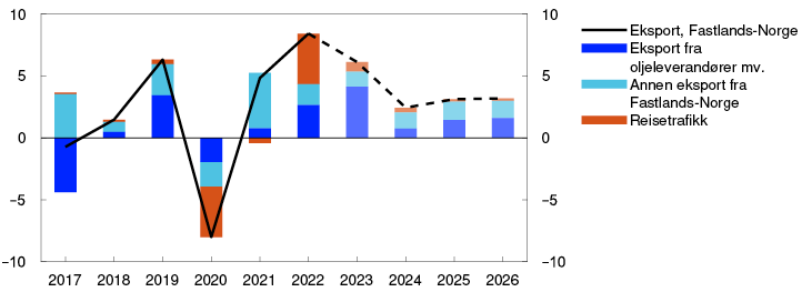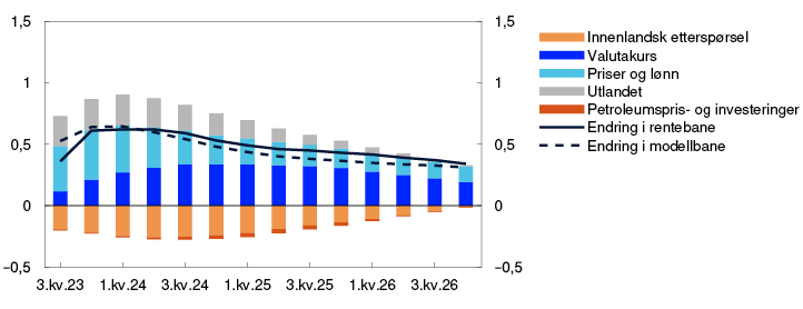 Vi legger til grunn at styringsrentene endres i tråd med markedets renteforventninger, og at råvareprisene utvikler seg i tråd med fremtidsprisene. Etter hvert vil økt reallønn og lavere renteutgifter løfte husholdningenes kjøpekraft. Økte forsvars- og energiinvesteringer i Europa vil trolig også løfte aktiviteten utover i prognoseperioden. I Storbritannia er det planlagt tilstramming i finanspolitikken. Vi anslår at BNP-veksten hos handelspartnerne avtar fra 3,5 prosent i 2022 til 1,1 prosent i 2023, før den tar seg opp igjen i 2024, se tabell 1 i vedlegget. Anslaget for 2023 er oppjustert fra forrige rapport, mens anslaget for 2024 er nedjustert.