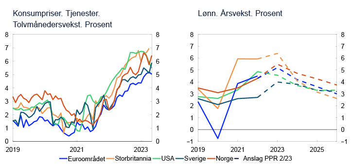 Kostnadene for å frakte varer er nå nede på nivåene fra før pandemien, og prisene på energi har falt mye i løpet av det siste året. Også prisene på flere råvarer, som metaller og matvarer, har avtatt siden årsskiftet. Det vil isolert sett dempe prisveksten på konsumvarer. Utviklingen i energi- og råvarepriser er nærmere omtalt i «Prisene på gass og kraft er noe lavere enn i mars». Lønnsveksten hos våre viktigste handelspartnere anslås å øke til 5 prosent i år. Vi venter at økte renter og lavere kapasitetsutnytting bidrar til at lønnsveksten gradvis faller i løpet av prognoseperioden. Langsiktige markedsbaserte inflasjonsforventninger er nær inflasjonsmålene i både USA og euroområdet. Siden forrige rapport har inflasjonsforventningene steget litt i euroområdet, mens de er lite endret i USA. Vi anslår at den underliggende prisveksten for handelspartnerne samlet øker fra 4,8 prosent i 2022 til 5,3 prosent i år og deretter gradvis avtar til rundt 2 prosent i 2026. Anslagene for både lønns- og prisvekst er oppjustert fra forrige rapport for 2023 og 2024.
