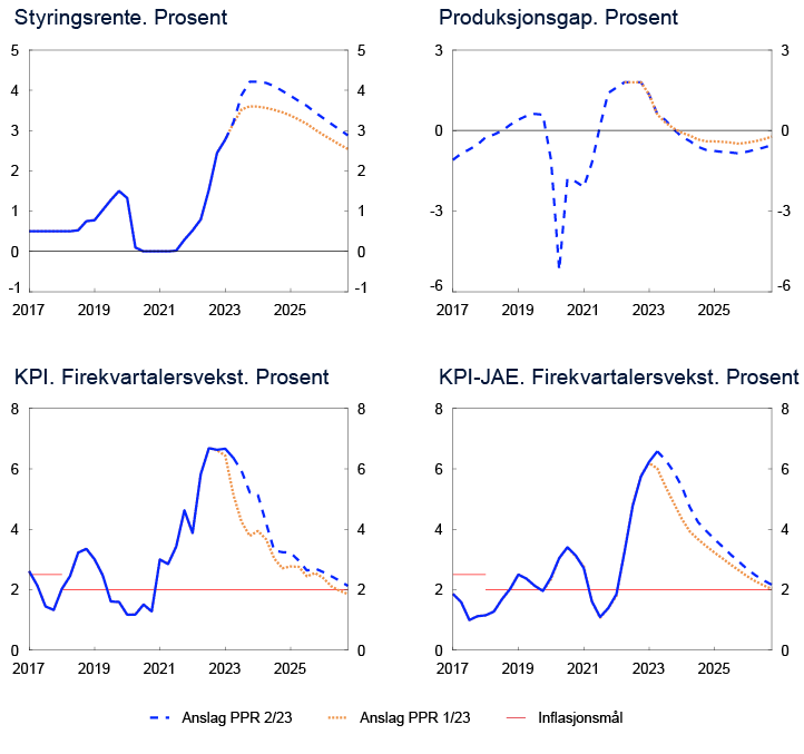 6 Periode: 1. kv. 2017 – 4. kv. 2026. Anslag fra 1. kv. 2023 for PPR 1/23 og 2. kv. 2023 for PPR 2/23 for styringsrente, KPI og KPI-JAE. Produksjonsgapet måler den prosentvise forskjellen mellom BNP for Fastlands-Norge og anslått potensielt BNP for Fastlands-Norge. KPI-JAE: KPI justert for avgiftsendringer og uten energivarer.